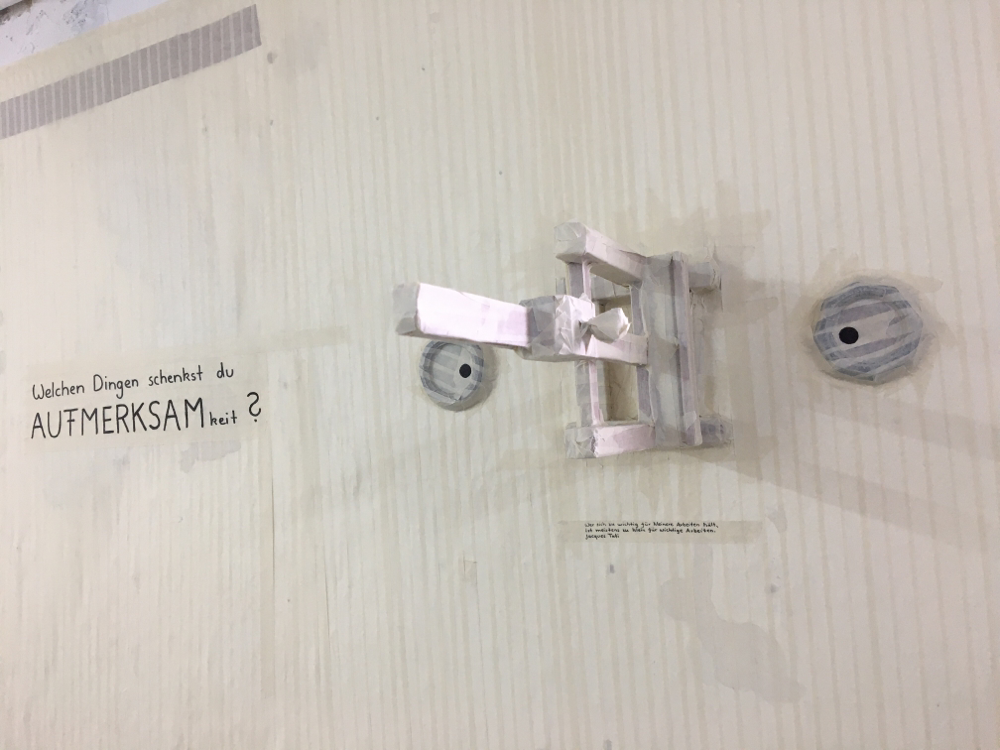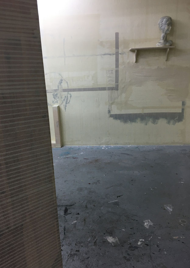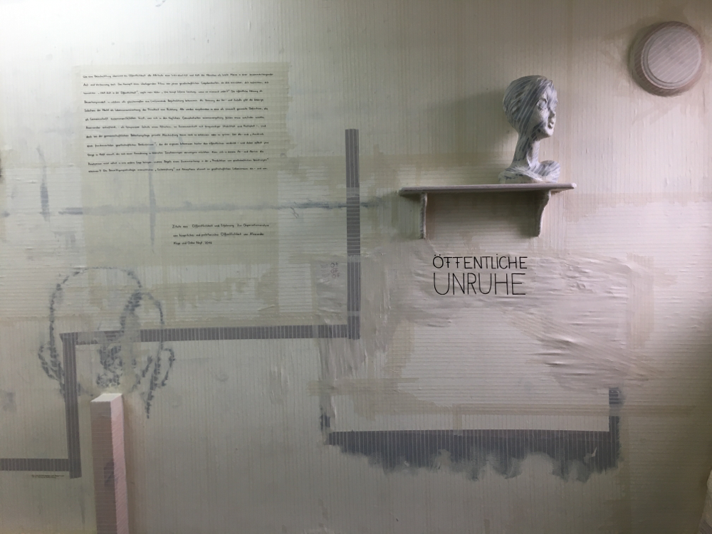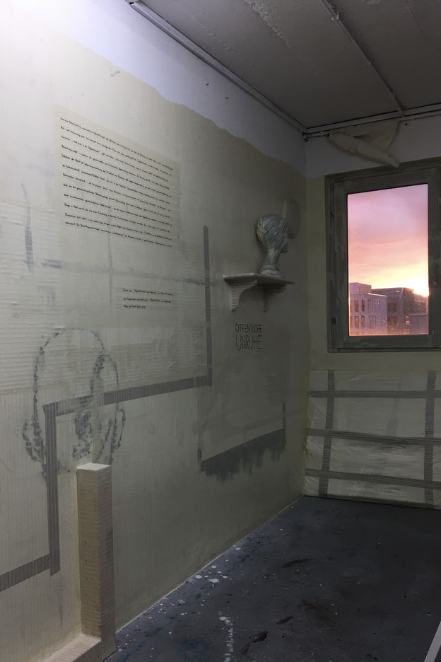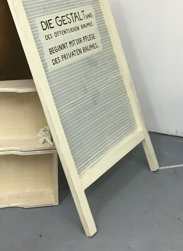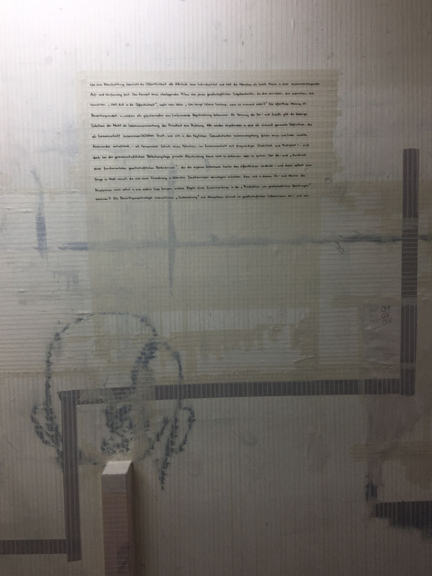 Bei Auszug bricht die Intimität in dem öffentliche Raum ein. Ausbruch aus Ordnung und Struktur. In neuen Identitätsfeldern muss ein neues Ordnungssystem erforscht und initiiert werden. Freiheit und Zielstrebigkeit im weiten Raum, der sich öffnet. Klare Linien, die durch unruhige Erfahrungswerte durchbrochen werden, welche doch im überschaubaren Rahmen zu bleiben scheinen. Während das Abenteuer des Erlebens erfahren wird, erscheinen schon erste Plus und Minuspunkte des Lebens, die "am eigenen Leib" erfühlt werden. | When you move out, intimacy collapses into public space. It is a break from order and structure. A new system of order must be researched and initiated in new possibilities and fields of identity. Freedom and determination in the wide space that opens up. Clear lines that are broken by restless experiences that seem to remain within manageable limits. While the adventure of development is being experienced, the first advantages and disadvantages of life appear, which you can feel “firsthand”.