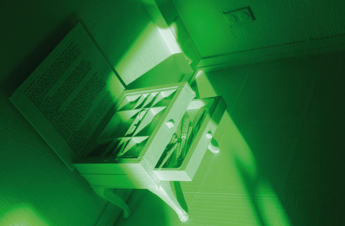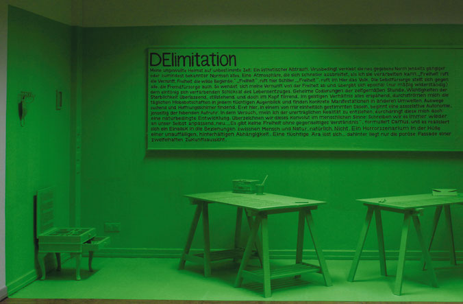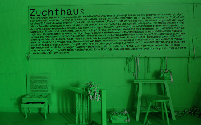 Gefangen in meinem Atelier schrumpft der Lebensraum. Der Alltag wird überdeckt und überlagert von jener Farbe, die die Welt vorgibt – giftig, grün – und vergessen lässt, was einst Normalität war. Eine temporäre Einrichtung.